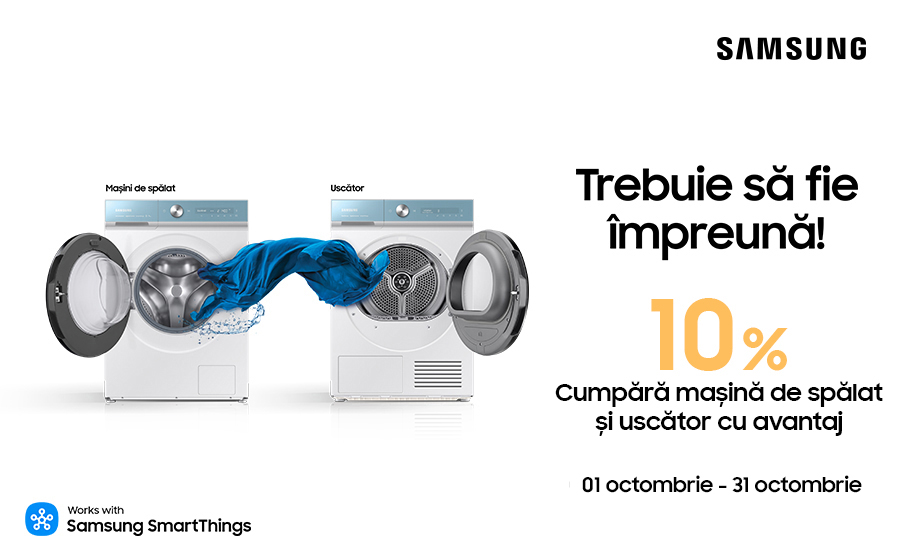 Cumpără mașină de spălat și uscător de rufe Samsung și beneficiază de o reducere de -10%, plus primești cadou un Kit de suprapunere.