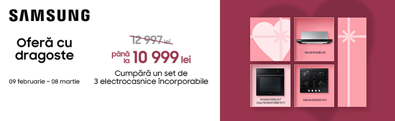 Cumpără un set de 3 electrocasnice încorporabile Samsung – plită, cuptor și hotă – la preț special de 10 999 lei.