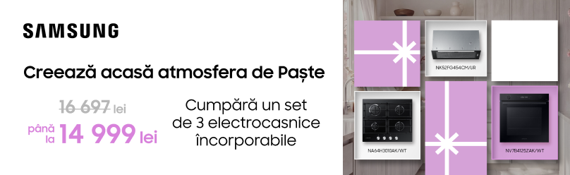Cumpără un set de 3 electrocasnice încorporabile Samsung – plită, cuptor și hotă – la preț special de 14 999 lei.