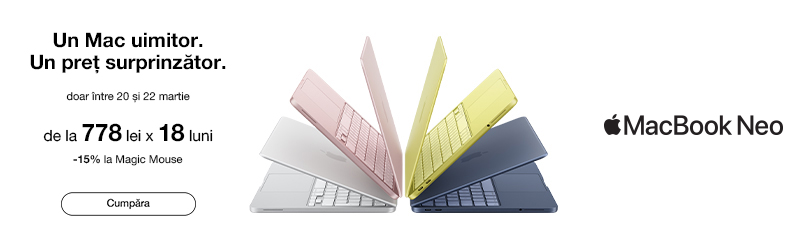 MacBook Neo — alegerea modernă pentru muncă, studii și sarcinile de zi cu zi. Alege plata în rate pe 18 luni și bucură-te de dispozitiv chiar de azi. În plus, beneficiezi de reducere la Apple Magic Mouse — pentru un plus de confort și productivitate.
