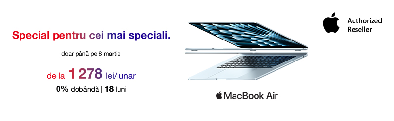 MacBook Air de 13″ și 15″ pot fi achiziționate în rate pe 18 luni, fără costuri suplimentare.