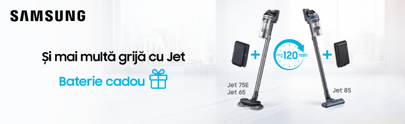 Cumpără un aspirator Samsung Jet împreună cu un acumulator suplimentar și beneficiază de -50% reducere la baterie – pentru curățenie fără pauze și griji!