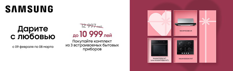 Приобретите комплект из 3 встраиваемых бытовых приборов Samsung — варочную панель, духовой шкаф и вытяжку — по специальной цене 10 999 леев.