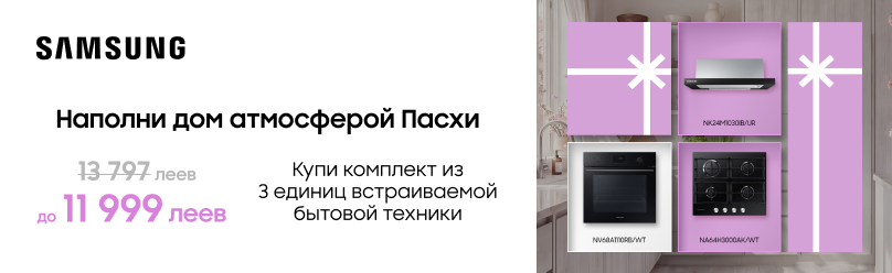 Приобретите комплект из 3 встраиваемых бытовых приборов Samsung — варочную панель, духовой шкаф и вытяжку — по специальной цене 11 999 леев.
